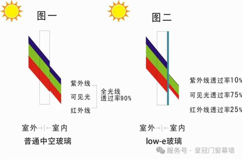 Low-E(Low Emissivity)玻璃,即低辐射玻璃,其核心在于玻璃表面镀有多层金属或其他化合物组成的薄膜。这层薄膜有两大超能力,即选择性透光和热量控制:其镀膜层具有对可见光高透过及对中远红外线高反射的特性,与传统玻璃相比,它既像“滤光镜”般保留光线,又充当“保温层”减少热量交换。